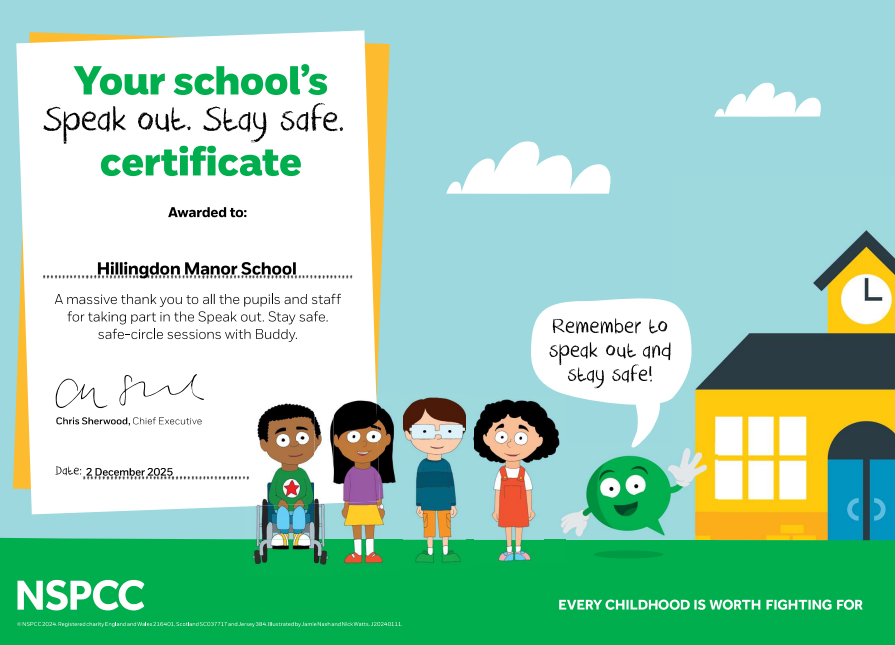 We are thrilled to announce that Hillingdon Manor School have been awarded an NSPCC ‘Speak Out, Stay Safe’ Certificate!
